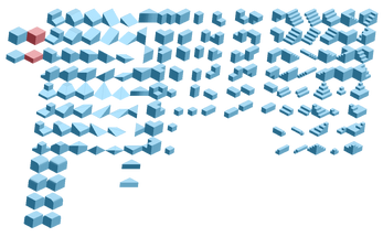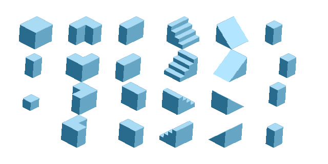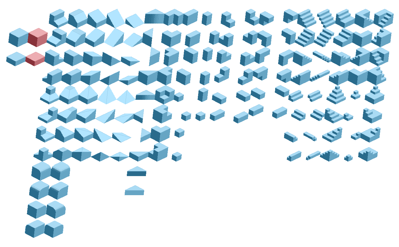 It includes a wide range of geometric primitives: cubes, slopes, corners, platforms, and multiple stair variations.